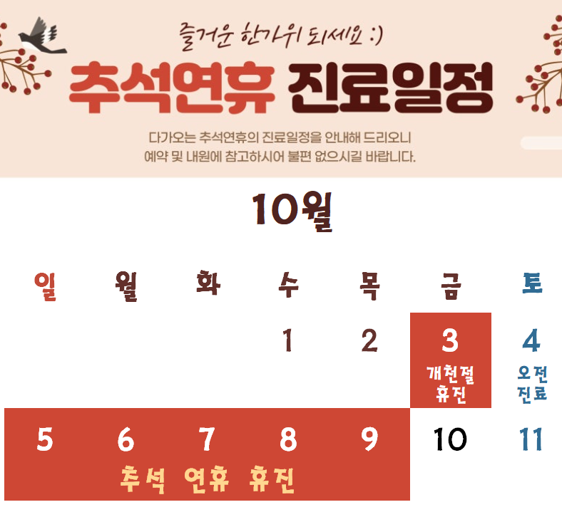 10월 8일 (수요일) 대체공휴일은 휴진하오니 진료에 참고하시길 바랍니다.