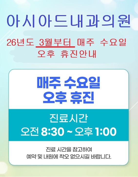 26년도 3월부터 아래와 같이 매주 수요일은 오전 진료만 시행 하오니 진료에 참고하시기 바랍니다.