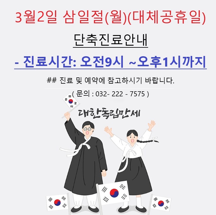 3월 2일 월요일 삼일절 대체공휴일 오전 단축진료 안내
